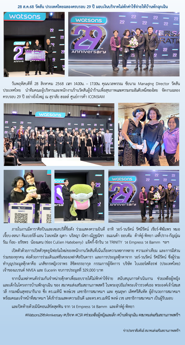 28 ส.ค. 68 วัตสัน ประเทศไทยฉลองครบรอบ 29 ปี มอบเงินบริจาคไม่หักค่าใช้จ่ายให้บ้านพักฉุกเฉิน