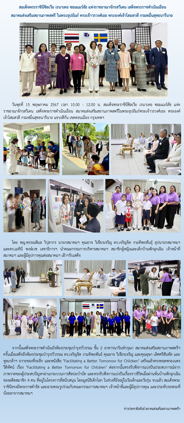 15 ต.ค. 67 สมเด็จพระราชินีซิลเวีย เรนาเทอ ซอมแมร์ลัธ แห่งราชอาณาจักรสวีเดน เสด็จพระราชดำเนินเยือน สมาคมส่งเสริมสถานภาพสตรี ฯ