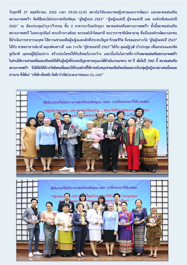27 พ.ย. 63 สถาบันวิจัยบทบาทหญิงชายและการพัฒนา สมาคมส่งเสริมสถานภาพสตรีฯ จัดพิธีมอบโล่รางวัลประกาศเกียรติคุณ