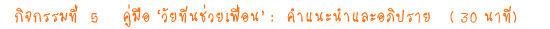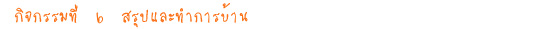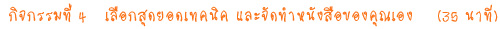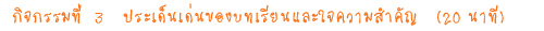 นำเอกสารสรุปของกิจกรรมที่แล้ว จากนั้น สรุปประเด็นสำคัญที่สุดในแต่ละบทที่นักเรียนต้องการนำมาแบ่งปัน/ ถ่ายทอดแก่เพื่อนๆ