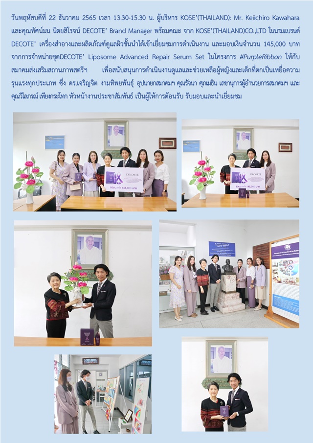 22 ธ.ค. 65 KOSE'(THAILAND)CO.,LTD ในนามแบรนด์ DECOTE' มอบเงินบริจาคจากโครงการ PurpleRibbon ให้กับสมาคมฯ